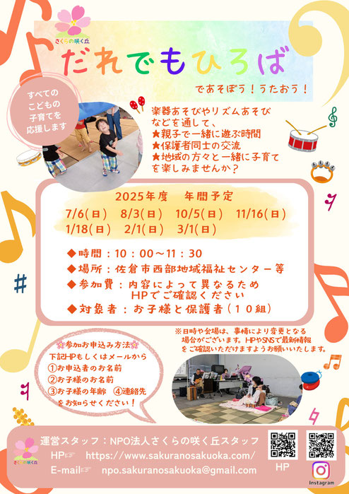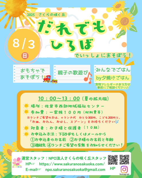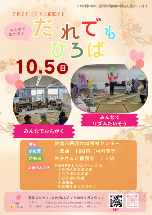 次回のさくらの咲く丘だれでもひろばは、10/5(日)10:00~11:30です。場所は、いつもの佐倉市西部地域福祉センターです。リズム体操のようこ先生とのコラボの予定だよ。お楽しみに♡